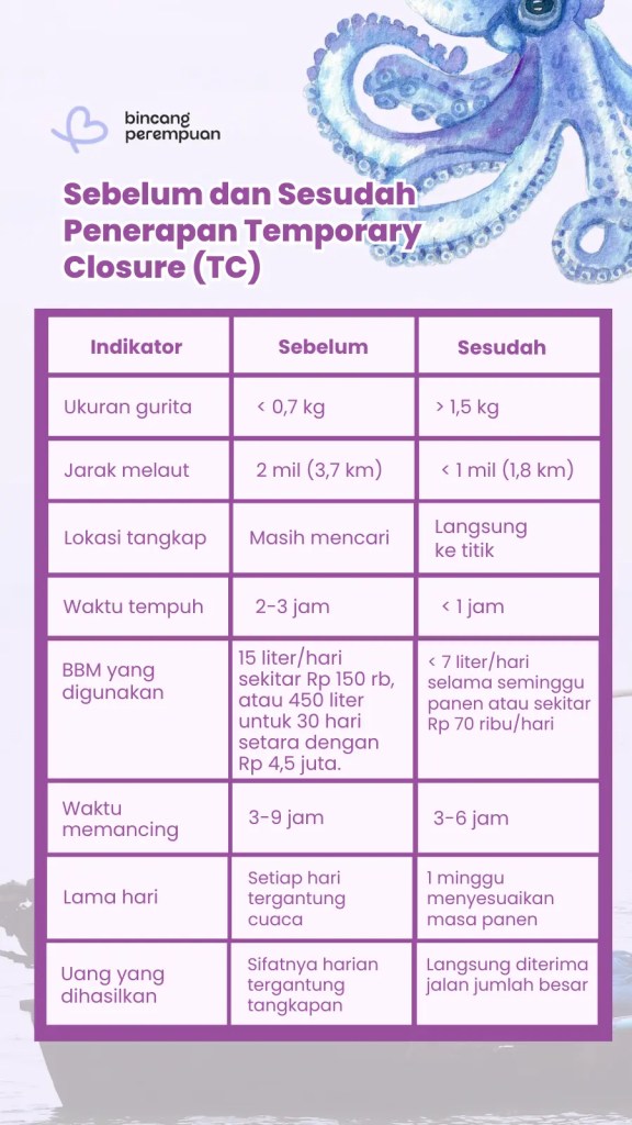 Adanya titik penutupan sementara, lanjut Bambang, membuat nelayan tidak lagi harus mencari-cari gurita di laut lepas. Mereka langsung menuju lokasi yang sudah diketahui. Jaraknya pun lebih dekat, sekitar satu mil dari pantai. Waktu melaut menjadi lebih singkat dan konsumsi bahan bakar ikut berkurang.